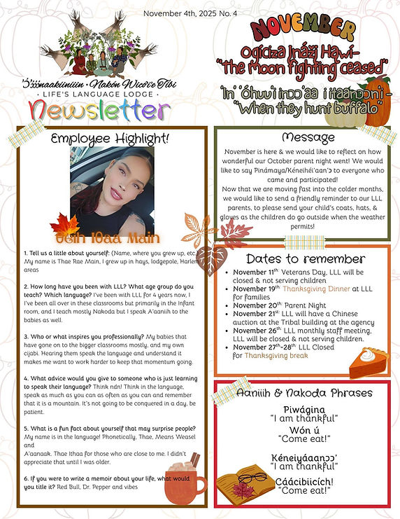 "To revitalize the Aaniiih and Nakoda Languages by immersing children in daily speaking, listening, and cultural traditions. To foster a safe inclusive learning environment, ensuring the survival and continuation of our identity"